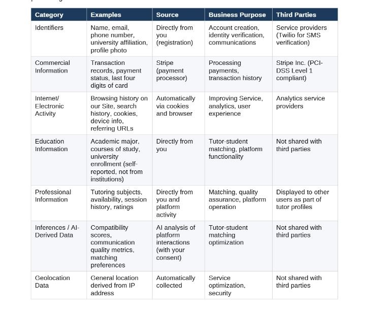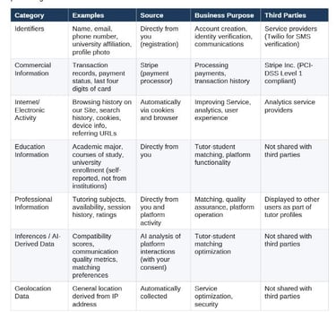 purposes, and third parties with whom each category is shared. This disclosure covers the